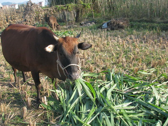 我们种养场本没有养牛,但是因为是租本地农民的田种植草,几家养牛的农夫就经常收我们的皇竹草、甜象草喂牛,经过向农夫了解;他们说牛开始也不怎么吃皇竹草、甜象草,经过几天适应后就很喜欢吃了。秋季前他们还收割了很多草叶晒干准备在冬天粉粹发酵给牛吃,他们都说这个冬天牛很好过冬了,人也不用在外面吹西北风了,这个草真是太好了,明年我们也种一些给牛吃。