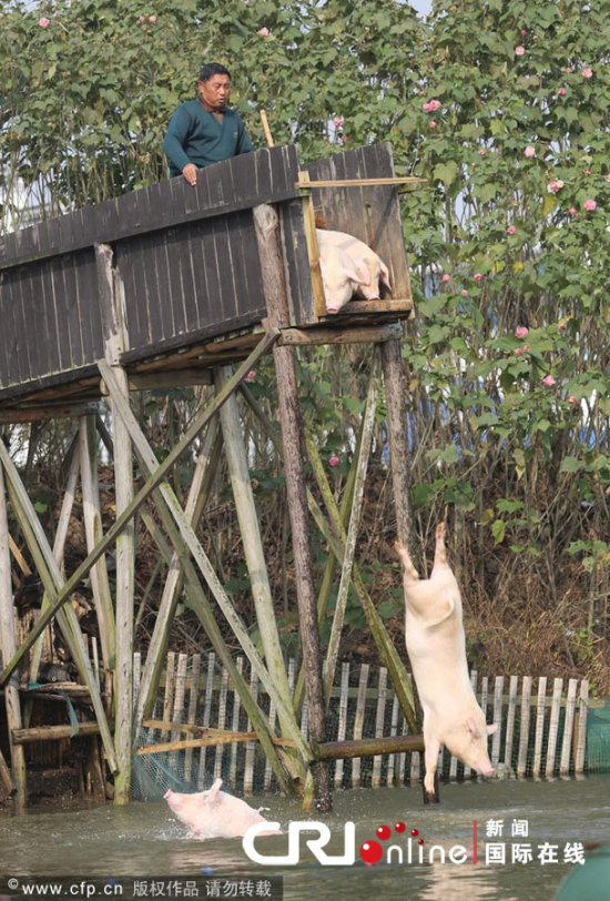 湖南省宁乡县金洲镇关山村村民黄德民将饲养的土猪赶往高台进行跳水锻炼,通过游泳锻炼来提高猪的免疫力,增加猪的进食量和生长速度,提高猪肉的品质和口感。黄德民向记者介绍,经过跳水游泳锻炼的猪肉价钱比市场上普通猪肉价钱要高近3倍。同时猪跳水(当地俗称猪八戒跳水)已成为关山村一个吸引众多游客的景点。