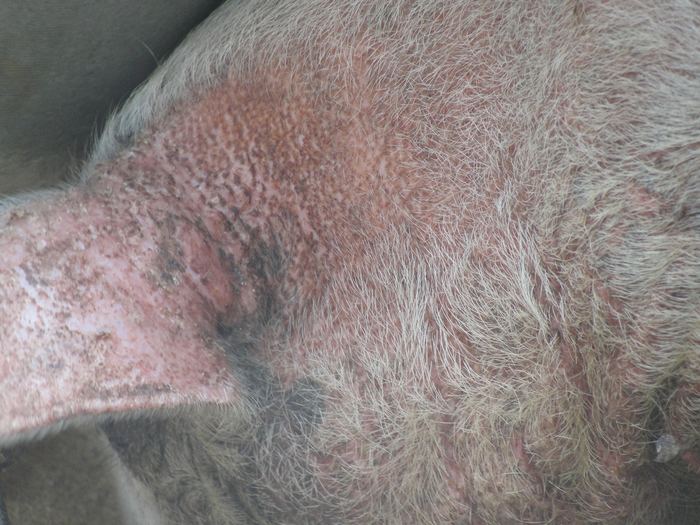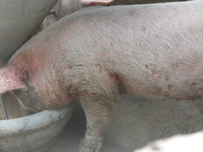 一头50斤左右的小猪,吃食正常,得了严重的皮肤病,已经有一个月了,但就不知道是什么病?怎么治疗?请各位版主及朋友指教,谢谢!