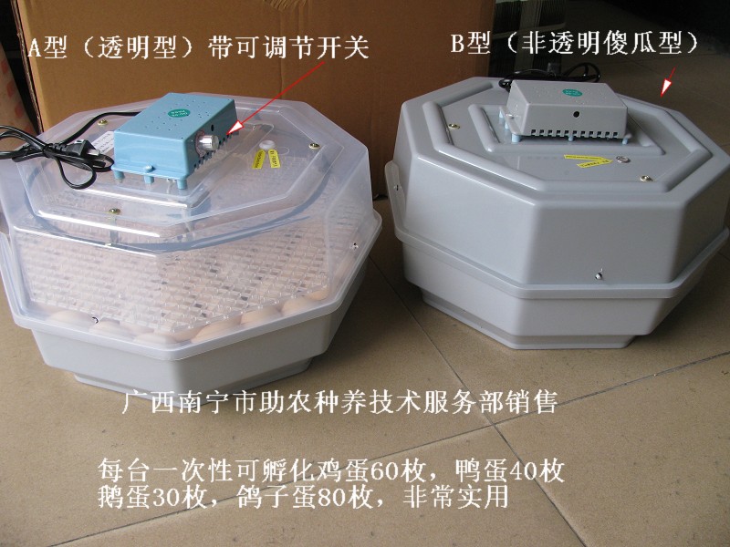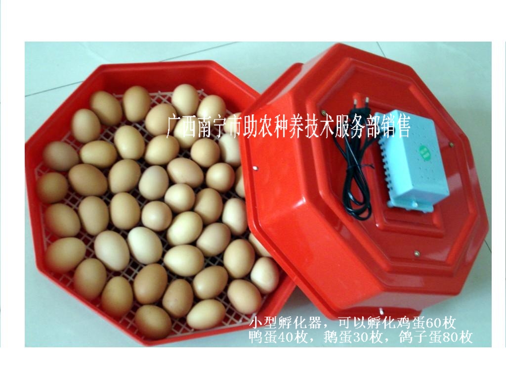 外贸新产品—— 家禽恒温电热孵化器 本孵化器专为家庭养殖户、中小型家禽养殖场设计的,使用220V电源,傻瓜式恒温设计,以最简单的操作达到最佳的禽蛋孵化成功率。目前已经出口多个国家。 本孵化器可适用孵化鸡、鸭、鹅、鸽子等其它训养禽类,每一次可孵化一种家禽,比如:鸡蛋60枚,鸭蛋50枚,鹅蛋30枚、鸽子蛋80枚等。 本孵化器特点 质量可靠:按国际标准设计和生产。 操作简便:不用专业培训,只要阅读说明书便可操作。 价格实惠:本孵化器按农村家庭使用设计,实用性强。价格不到同类设备的30%。 使用寿命长:循环使用,可用多年。 外形尺寸: 45×45×20 使用电源:220V 50Hz 总销售商:广西南宁市助农种养技术服务部 地址:广西南宁市安吉路35号南栋7号 电话:0771-3123310,2204816,3800156(兼传真) 网址:www.syc163.com,邮箱:znfwb@163.com