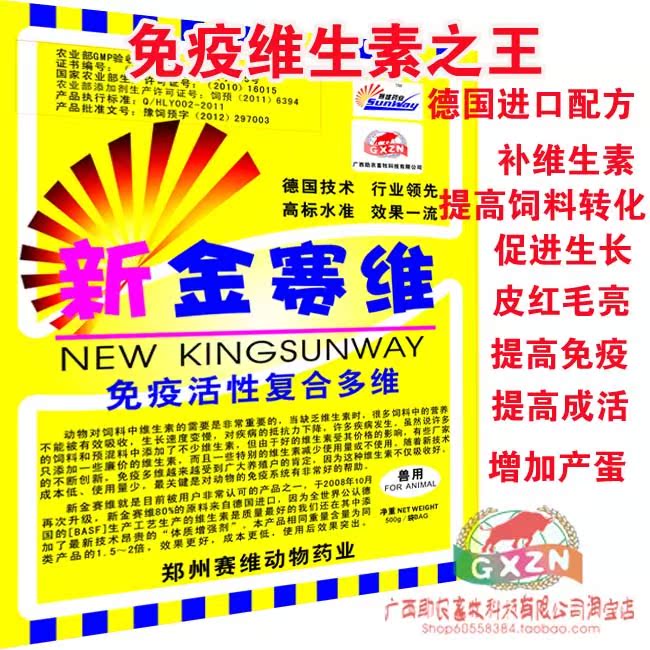 【兽药名称】通用名:免疫活性复合多维 商品名:新金赛维 【适应症】最新科研产品,本品采用先进包合技术,提高了产品的水溶性、稳定性和生物利用度。本品能保证 畜禽的正常生理功能所需的各种维生素、氨基酸和微量元素,有效防止维生素缺乏,抗应激,提高肌体免疫功 能。 1、家畜使用本品可提高胴体瘦肉率及饲料转换率,使其皮红、毛亮、粪发黑、出肉率高。 2、雏禽使用本品可提高群体成活率和整齐度;肉禽使用本品可使其羽亮、脚黄、冠红、胴体健黄;蛋禽使用本 品可提高饲料转换率和产蛋率,延长产蛋高峰期,明显增强蛋壳颜色,改变蛋的品质。 3、种畜禽使用本品可提高受精率和种蛋的孵化率。 4、有效抵抗或缓解畜禽各种应激,如:断喙、转群、换料、酷暑严寒、长途运输等引起的应激。 5、免疫前后三天使用,能迅速缓解免疫应激,提高肌体的抗病能力。 【主要成份】每千克含量(全部为≥): 维生素A:88000000IU 维生素E:60000IU 维生素B2:20g 生物素:10g 泛酸钙:50g 钾钠锌等:30g 加丽红:400mg 吸附剂:适量等 维生素D:25000000IU 维生素K3:10g 维生素B12:20g 叶酸:800mg 赖氨酸:30g 体质增强剂:10g 活性复合酶10g 维生素C30000mg 维生素B1:10g 维生素B6:5g 烟酸:10g 蛋氨酸:60g 加丽黄:400mg 美他营养素:1000mg 【性状】本品为淡黄色或黄色粉末。 【用法用量】 特种动物:如狗、豚鼠、兔、狐、貂等动物,每1000公斤饲料中使用130克。体弱的动物可以加倍使用。鸡鸭鹅:1-2周,每1000公斤饲料中使用100-150克,2周以上使用150-200克,蛋禽使用250克,饲料厂做4%肉禽预混料每 吨预混料使用3公斤,蛋禽4%预混料吨预混料使用3公斤。 母猪:空怀期1000公斤饲料中使用120克,怀孕和哺乳期使用150克,饲料厂做母猪4%预混料时每吨预混料使用3-4 公斤。 肉猪:小猪每1000公斤饲料中使用120克,中大猪使用100克,饲料厂做肉猪4%预混料时每吨预混料使用3-3.5公斤。 牛羊马等草食动物:每1000公斤饲料中使用80克,饲料厂做草食动物4%预混料时每吨预混料使用2公斤。 水产鱼类:每1000公斤饲料中使用160克,饲料厂做水产预混料时每吨预混料使用4公斤。