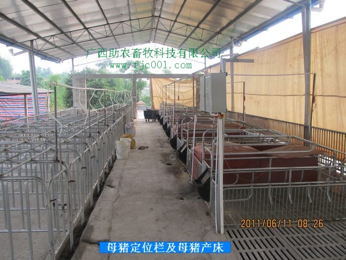 本技术就是让母猪身体后部分生活在漏粪板上,漏粪板0.8米下面是垫料,垫料由我公司发明的自动翻耙机进行翻耙,平日管理只需要饲喂等即可,几乎不需要冲洗和清扫栏舍,为大型养殖公司和专业户通过了多赢的效果。