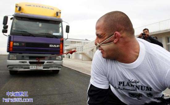 11月14日,格鲁吉亚鲁斯塔维,Lasha Pataraia在一次活动中用耳朵拉着一辆八吨重的卡车。
