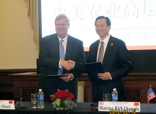 美国当地时间2012年2月16日,中美两国农业部在美国艾奥瓦州州府得梅因市举行首届中美农业高层研讨会。研讨会由中国农业部部长韩长赋和美国农业部部长维尔萨克共同主持。韩长赋、维尔萨克、美国驻中国大使骆家辉、艾奥瓦州州长布兰斯塔德分别致欢迎辞。来自中美两国150多位农业部门官员和专家学者参加研讨会。