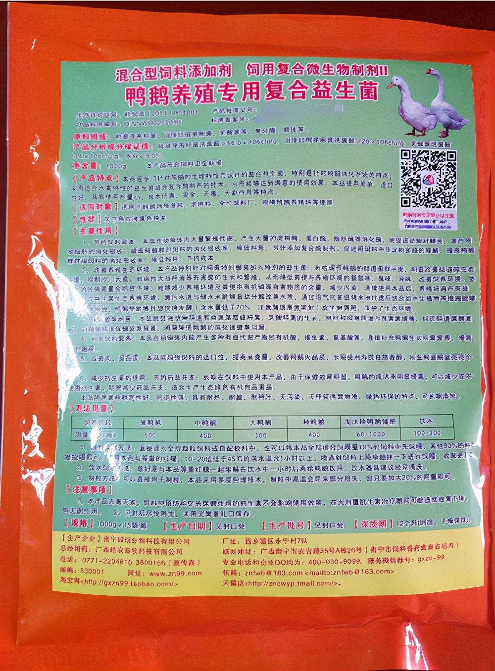 使用方法也简单,可以是混料饲喂,直接混入全价颗粒饲料或自配粉料中,也可以将本品全部混合饲喂量10%的饲料中先饲喂,其他90%的料直接投喂即可。或将本品1包、1包等量的多糖性复合菌种营养基混合后加入10-20倍低于45℃的温水发酵1小时以上,喷洒到饲料上简单翻拌一下进行饲喂,效果更显著。再者就是饮水饲喂,将这个益生菌与相同重量的红糖一起溶解在饮水中一小时后再给鸭子饮用。饮水器具建议经常清洗。
