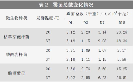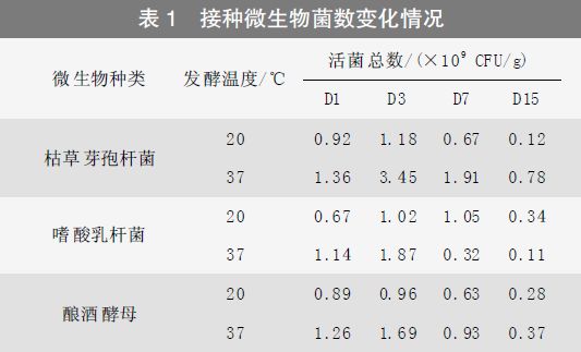 基础物料配制与接种:豆粕与水按2∶1 比例,枯草芽孢杆菌菌液、嗜酸乳杆菌发酵液、酿酒酵母菌液分别按豆粕重量的10%进行接种。分别在20℃、37℃进行厌氧固态发酵,在第1d(D1)、第3d (D3)、第7d(D7)、第15d (D15) 取样进行分析,测定接种微生物活菌总数、霉菌总数以及小分子蛋白等生化指标。