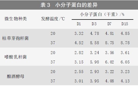 由表3可知,芽孢类微生物固态发酵豆粕后产生的小分子蛋白最多,可达8%以上,其次是乳杆菌类发酵豆粕,最次是酿酒酵母。20℃时,从小分子蛋白含量变化情况看,豆粕发酵程度非常低,远远低于37℃条件下的发酵水平。从时间上看,在第3 d 后,小分子蛋白的含量虽略有上升,但基本上变化不大,显示前3d的豆粕发酵至关重要,此段时间,菌株处于最佳的活力状态,且在分子水平对豆粕的发酵已基本完成。