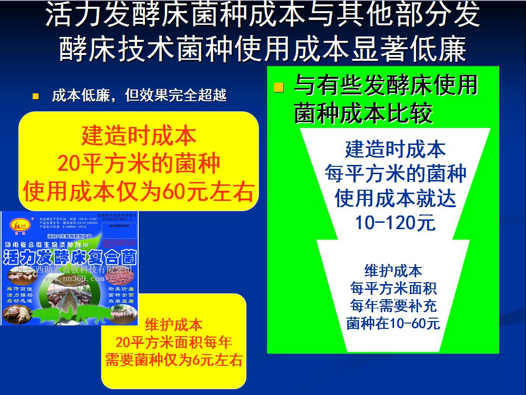 肯定地告诉大家,有这样的菌种,它就是“发酵床复合菌”,是我国唯一自主知识产权发明的产品,获得多个发明专利与大奖,由江西宜春强微生物科技有限公司研制生产,由广西助农畜牧科技有限公司全国总经销的专业发酵床菌种,制作的成本每平方仅仅是3元,维护成本更低,每20个平方米面积一年的维护菌种成本不超过6元,发酵床菌种成本远比国内的同行低,而且使用的效果一点都不差,每克垫料中有益微生物的浓度达到了千万的数量级,每克垫料含为3千万个有益微生物,比一般同行的菌种每克垫料的有益微生物浓度多10倍。