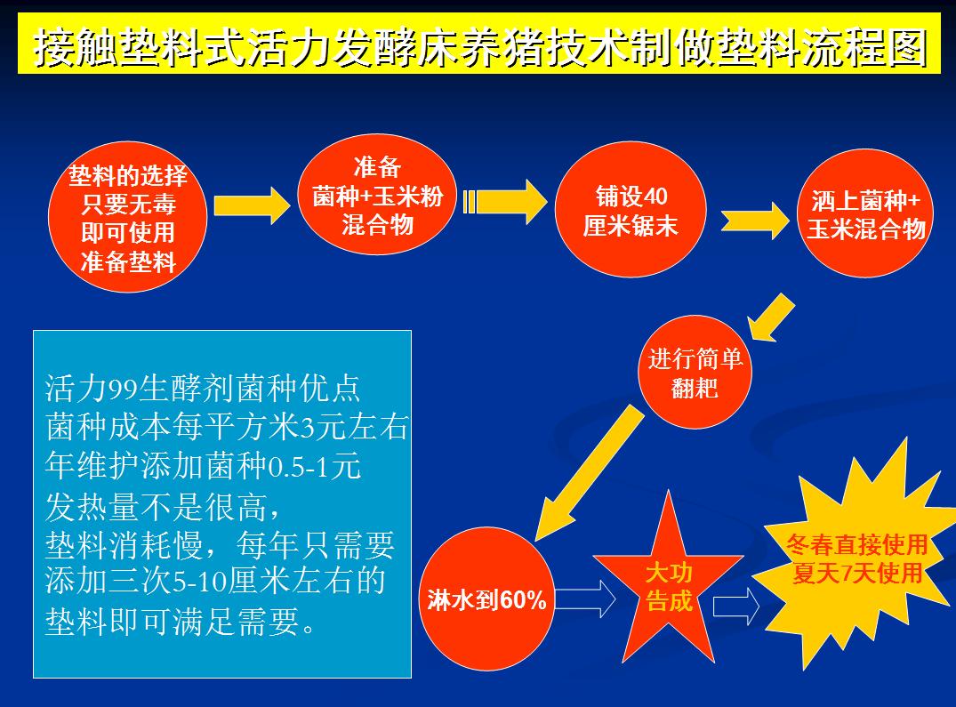 最关键是,活力发酵床养殖技术的垫料制作与维护操作非常简单,只要将垫料置于养殖区,将菌种与极少量玉米粉混合于垫料中,洒上水简单搅拌即可使用,不需要多次搅拌和发酵;每批动物出栏后,也只需要将上层翻耙一下,补少量的菌和水即可,不会像某些技术要将垫料全部勾出,添加菌种,来回翻耙再发酵,造成巨大的人力成本等。