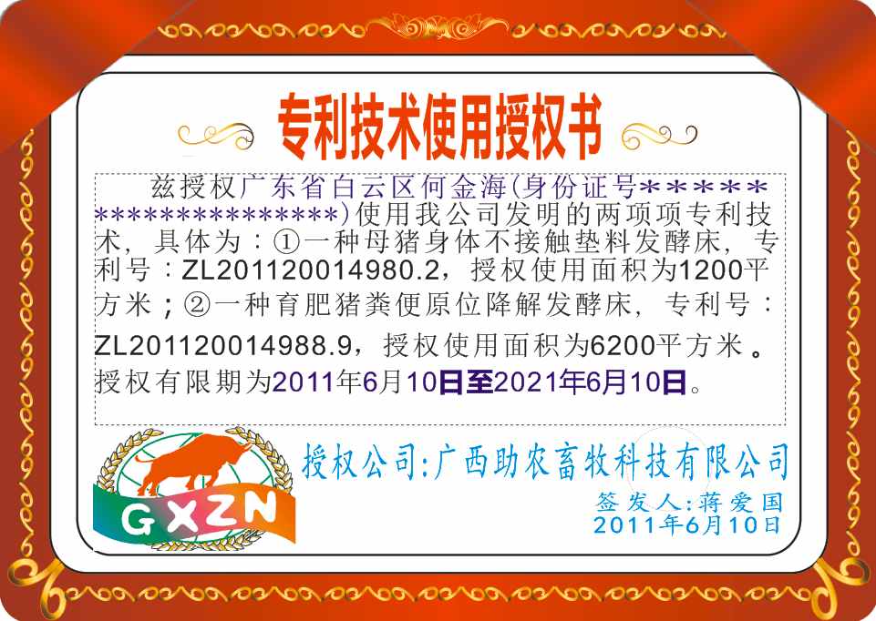 2.我们会根据您申请的具体实施面积要求您购买相应的菌种,并免费将《专利技术授权使用证书》发给您,请您按照申请的面积进行使用,超出面积请您再次申请,否则将是侵权;《专利技术授权使用证书》不仅是您合法使用的证明,也是给当地领导看的最好材料,特别是您在申请补贴时非常有用。如果没有获得我们的《专利技术授权使用证书》就建设我们的技术模式饲养或者私自生产安装垫料电动翻耙机,这就是侵权行为,被我们与全国几百个服务网点发现肯定要被我们的大律师团起诉的,并进行赔偿,严重的要拆除建设等。《专利技术授权使用证书》是免费的,只要购买我们一定量的菌种即可获得(例如您需要建设100平方米面积我们专利技术发酵床养猪模式,只要购买100平方米的菌种,即5包活力发酵床复合菌即可免费获得《专利技术授权使用证书》),需要再增加使用面积时会要再次申请《专利技术授权使用证书》。我们在这里也要特别提醒大型养殖公司切记一定要获得我们的授权才施工和使用,以免造成不必要的麻烦和损失。