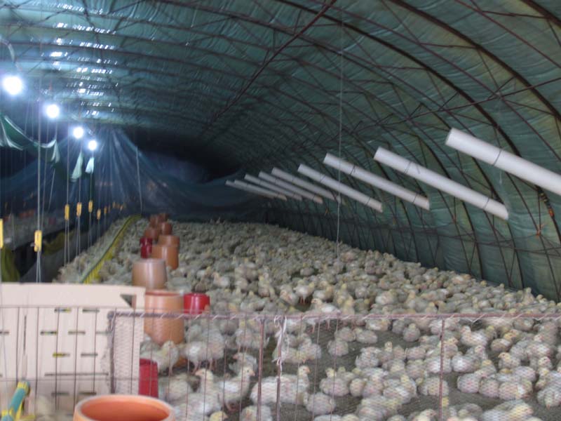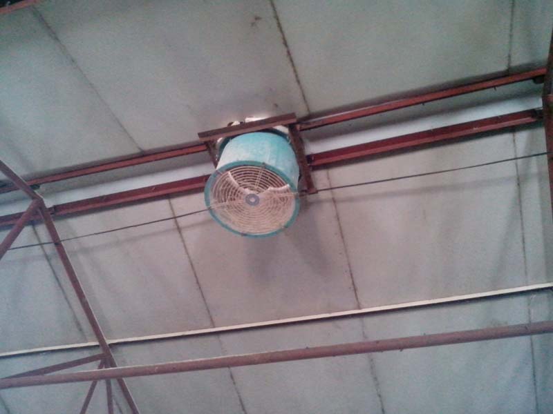 排风扇数量=鸡只数x鸡最大平均体重(公斤)x每公斤体重需排风量(0.017)/单个风机排风量=5000(只)x3.25(估计最大重量)x0.017/167 m3(单台风机风量)=1.65≈2台,需要2台这样的风机才可以,在实际应用中可能通风量会是最小通风量的2倍,所以至少需要3台风机进行换气。