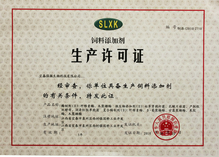 一般形式为饲添(20**)****(必须是国家农业部颁发的,许可证上明确地注明了该企业允许生产的微生物菌种名称和酶制剂品种名称);如宜春强微生物科技有限公司的许可证号是“饲添(2010)2750”,文件上面非常清楚地列出了微生物品种和酶品种。