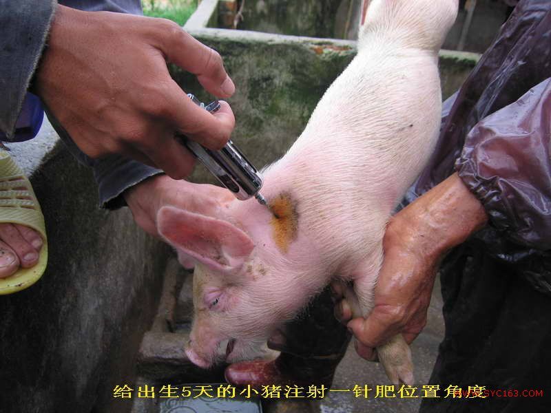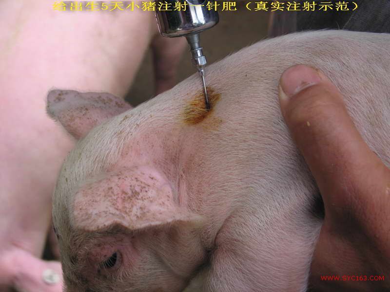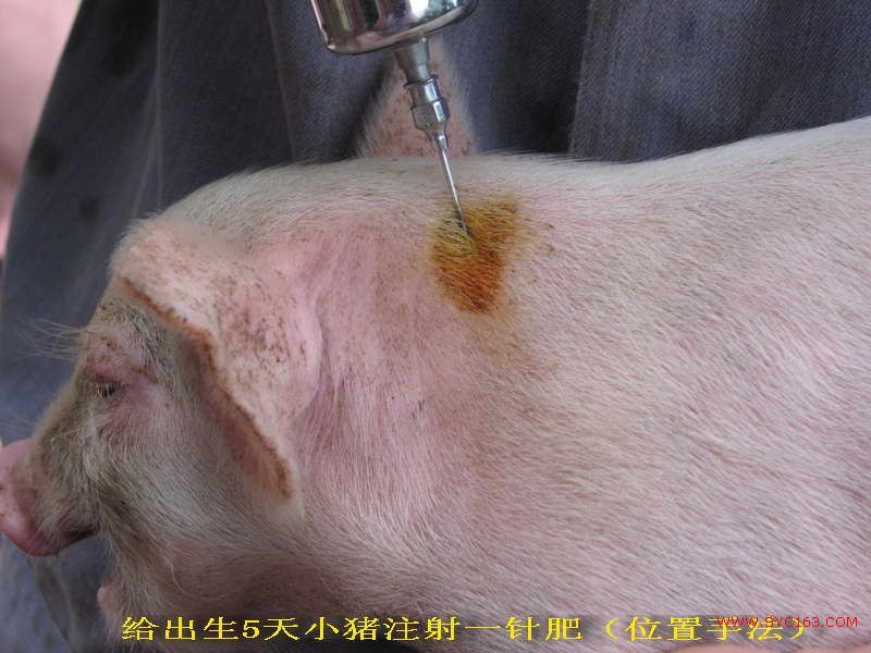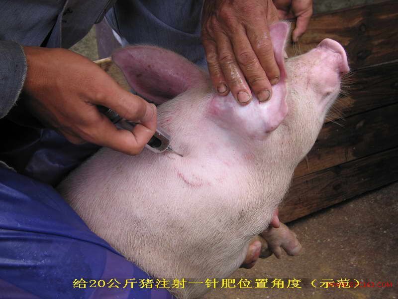 (2)小猪的使用方法和用量:体重为10~20公斤从其他养殖场或养殖户购买回来的小猪,如果确定该小猪之前没有注射过“一针肥”,则每头注射8~12ml,养殖直至出栏,不需要再打;注射部位:耳朵后三寸处颈中上部,针头长度为2.5厘米,注射时应在颈中上部对侧45度角进针,为达到最佳吸收效果,应分两边注射,两边各注射4~6毫升,注射前后都要严格用酒精或碘伏消毒。如果购买回来的小猪之前已经注射了“一针肥”,建议补注3~5支,一直养大到出栏。同时建议你配套使用“高效保健促长液”配合的饲料,不仅能节省大量饲料和药费,而且能提前很长时间出栏。最快时90天达到出栏规格(90公斤以上)。