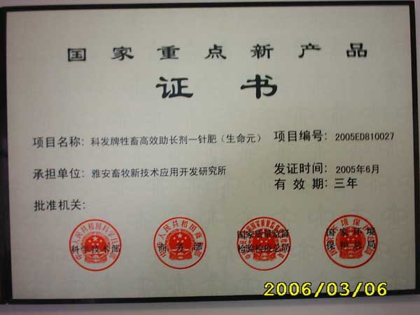 7.2005年荣获由中华人民共和国科学技术部、商务部、国家质量监督检验检疫总局、国家环境保护总局联合颁发的国家重点新产品证书,这一重奖在国内兽药行业非常罕见。