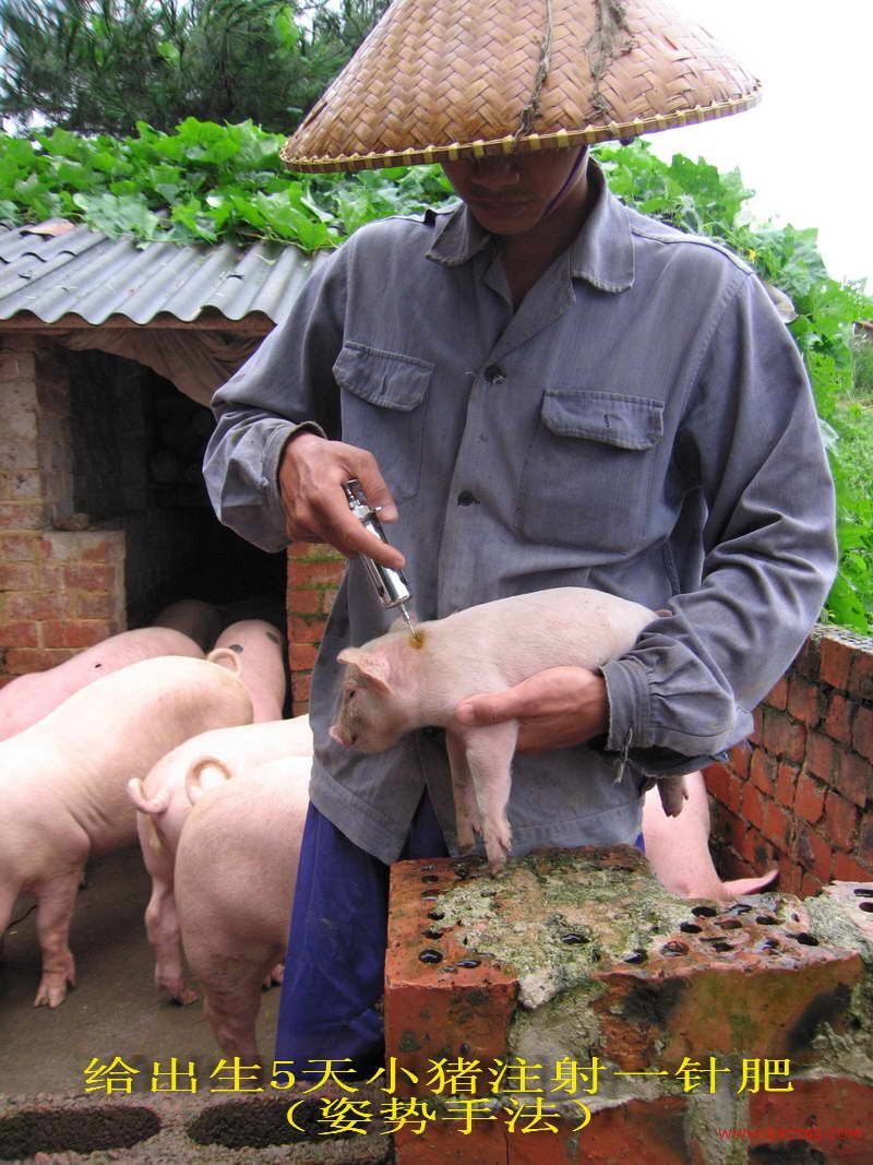 (1)仔猪的使用方法和用量:出生后3~7天内注射0.5--1.0ml,主要用于防病,直至养殖到60日龄出售;或者将2毫升一针肥兑2毫升葡萄糖或生理盐水一次性分两边注射一头小猪,效果比前一种要好很多。注射部位:耳朵后约两寸处颈中后部,针头长度为1.5厘米,注射深度1.0厘米。注射时应分两边对侧45度角向上进针,每边注射总量的1/2,这样吸收效果更好。注射前后都要严格进行消毒,推荐使用“碘伏消毒杀菌剂”。并结合灌服“高效保健促长液”与拌料饲喂,仔猪的生长速度极快,极少发病,断奶时个体重量最大可达到10公斤,杜绝黄白痢和水肿病的发生,极少发病,小猪个个健壮活泼,人见人爱。60日龄时,最大个体超过30公斤。