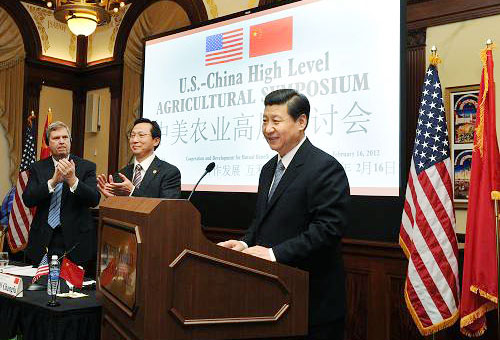 中国国家副主席习近平出席中美农业高层研讨会,并致辞。习近平在致辞中对中美农业高层研讨会的成功召开表示热烈祝贺。向参加此次研讨会的两国农业界人士表示诚挚欢迎。他说,民以食为天。农业是人类社会赖以生存发展的基础产业,从战略高度推动国际农业和粮食合作,对于促进各国互利共赢、共同发展具有重大而深远的意义。农业是发展中美关系、深化中美合作的重要领域。长期以来,中美农业交流合作保持稳定发展良好势头,这首先得益于中美两国同为农业大国,两国在农业领域具有重大共同利益和广阔合作空间。其次得益于中国在过去10年认真履行入世承诺,农产品关税水平降为世界平均水平的1/4。同时,还得益于两国政府高度重视,得益于两国农业部门在中美战略与经济对话、中美商贸联委会、中美农业联委会等多个机制下开展了顺畅、有效的对话和务实合作。