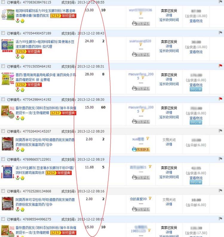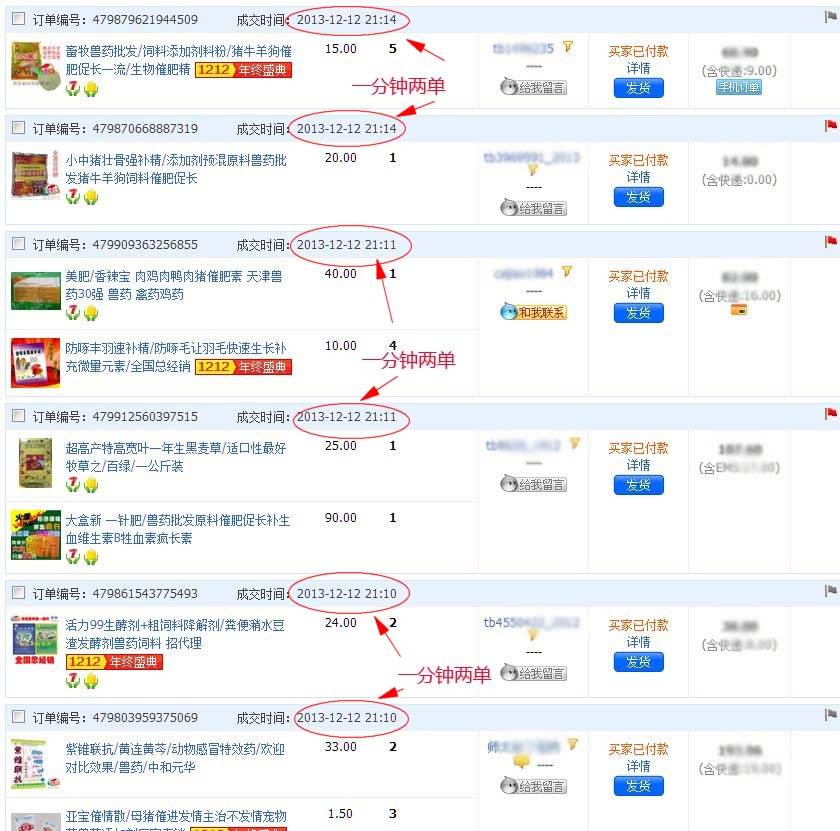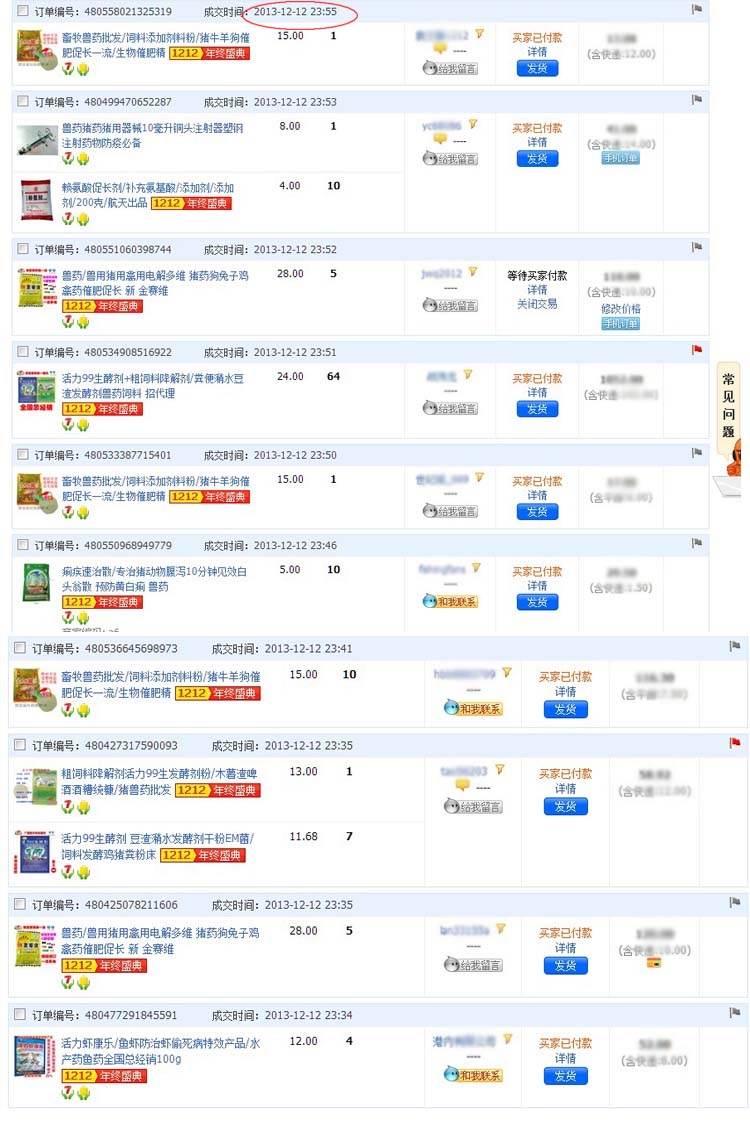 双十二的电商之战如火如荼,助农公司淘宝店也毫不逊色,本次双十二活动,助农淘宝店准备了四套疯狂促销计划,各种产品优惠多多,更有速治散、高效撤喂痢即停、重菌泰等畅销品随单赠送。据统计,本次双十二当天我公司淘宝店成交量一路飙升,平均每2.37分钟就有一笔订单成交,截止至12月12日23时59分,拍下总金额达11万余元,其中已经付款的笔数607笔,已经付款的金额累计达6.5万余元,迎来开店以来成交最高的一天!!在这次上十二活动中,明星产品活力99生酵剂+粗饲料降解剂组合装稳居销量冠军宝座,其他产品如金赛维、生物肥精、搅拌机等也一致受到众多买家的热捧,销量遥遥领先。