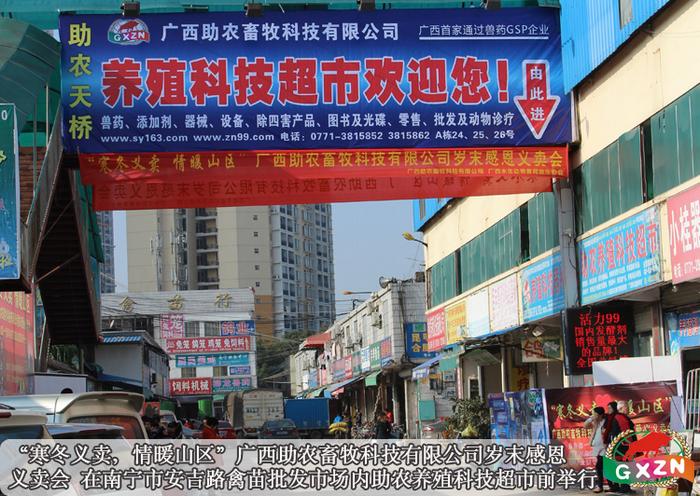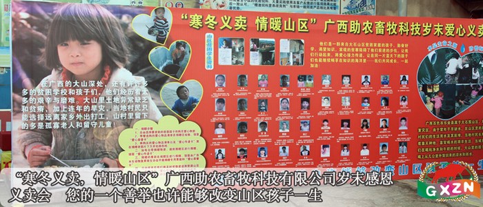 本网讯:2013年12月18日上午,由广西助农畜牧科技有限公司主办的“寒冬义卖,情暖山区”大型爱心义卖会上午10:30在南宁市安吉大道35号南宁市饲料兽药禽苗市场内助农养殖科技超市门前顺利举办。通过本次爱心义卖会方式,为都安、乐业、大化、宜州等山区里的贫困学校募捐体育用品及建立爱心图书室;为孩子们募捐过冬的衣服和鞋子,学习用品、生活用品及棉被等;为连年干旱的山区建立爱心水窖等