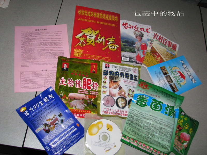 一、5包使用产品:“活力99生酵剂”、“毒菌清”、“痢疾速治散”、“生物催肥精”、“动物内外杀虫王”,产品总价值是60元。