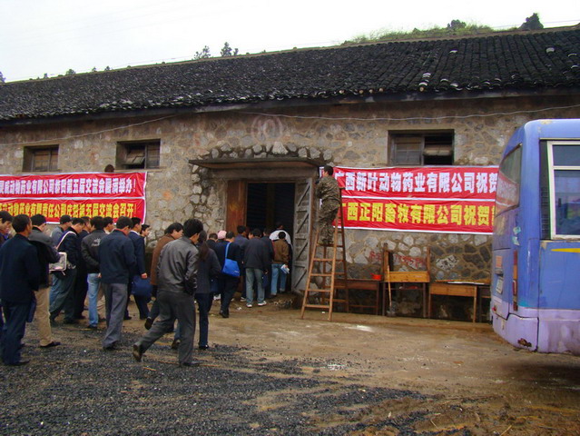 由左往右起分别是:灵威动物药业公司苏广波总经理,痢疾速治散发明人覃家雄老板,广西正阳畜牧有限公司总经理张伟