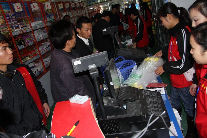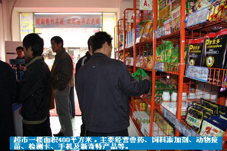 早上8点半,庆祝开业的鞭炮声响彻市场上空,紧接着是专业舞狮队做一个钟头精彩的舞狮表演,然后由参加庆典的领导进行开业剪彩,剪完彩后,超市正式营业,助农公司的全员工,一个个都穿着统一的制服,精神抖擞地迎接第一批顾客的光临,顾客们怀着好奇的心情走进这个全新的超市,各种超市大家见过多了,但是象这样规模的兽药超市几乎没有人见过,所以很多人都感到非常兴奋,特别是被这个养殖科技超市的规模及产品齐全程度所震撼,很多个顾客都发出由衷地赞叹,特别是超市产品品种很多,是令他们想都没有想到的,这个超市由两层组成,总面积