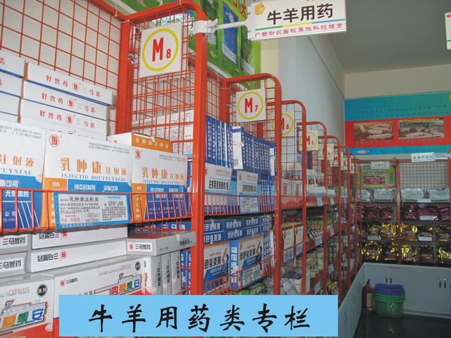 超市一楼兽药区,在这里不仅有成数千种的兽药,而且还有专业的技术员为你指导用药。