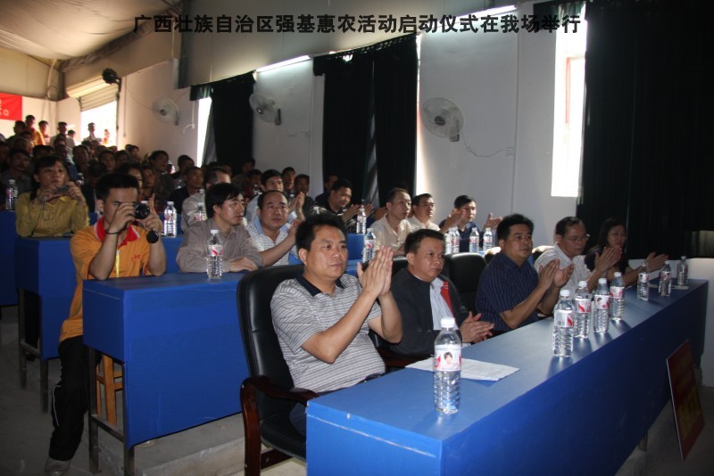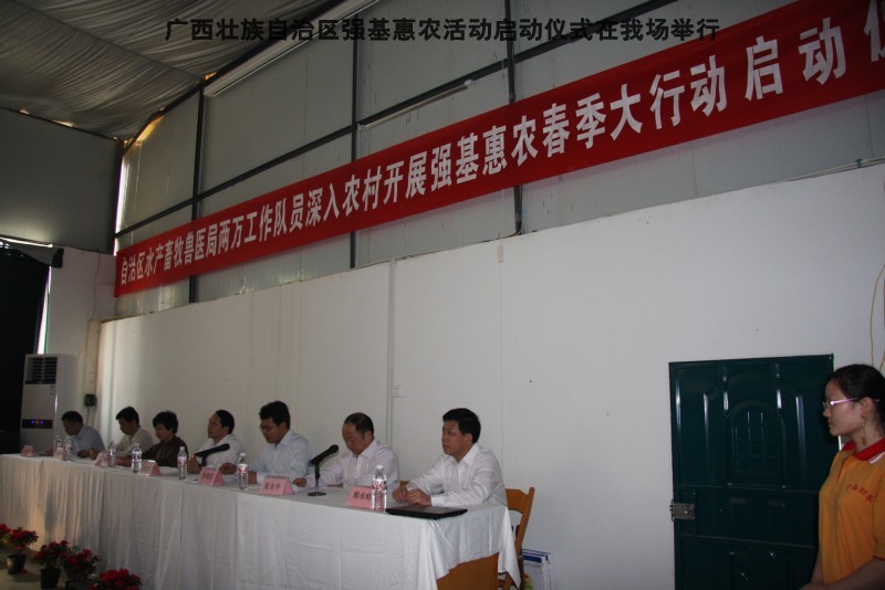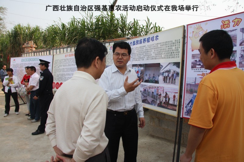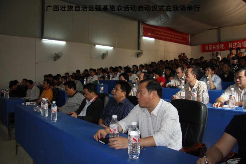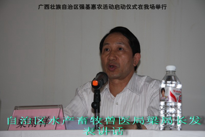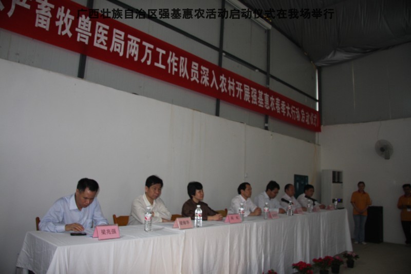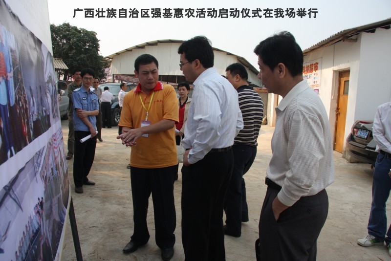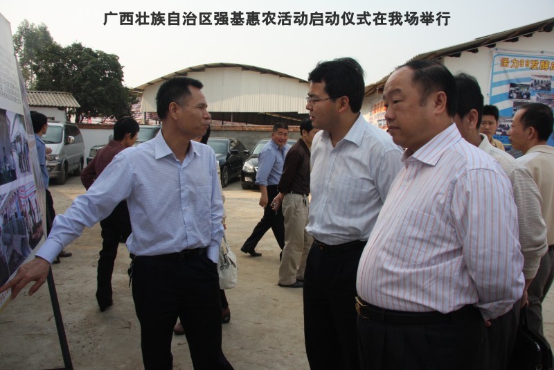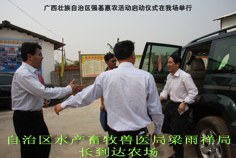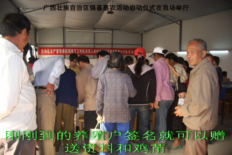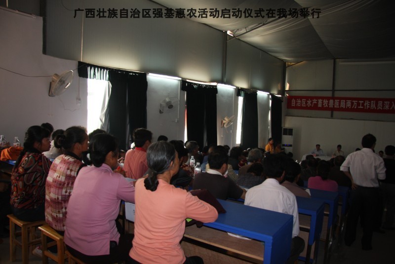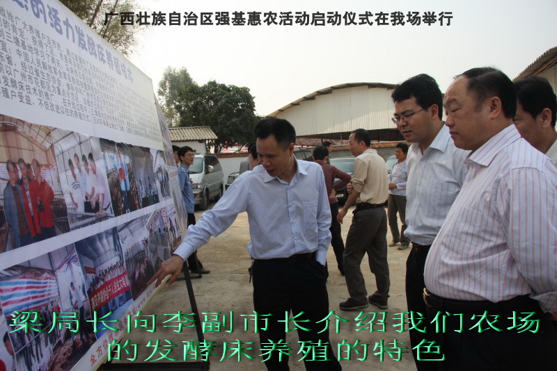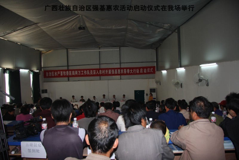 自治区水产畜牧兽医两万名工作队员深入农村开展活动启动仪式由粟永华主持,首先是介绍各位领导,对他们的到来表示感谢。然后几位领导分别发表讲话1.自治区水产畜牧兽医局梁雨祥局长。2.南宁市李国忠副市长。3 南宁市兴宁区高虹区长。领导讲话后,马上进行几个环节惠农活动,1.赠送养殖图书 由农民代表上来领取养殖技术资料和光盘。2.给养殖户赠送鸡苗 3.给我们养殖基地补助十万元强基惠农培训经费(用梁局长的话说,我们给他补助他也是补助农民这样很值得) 4.给我场颁发“强基惠农培训基地”称号5.参观活力发酵床养殖基地现场。