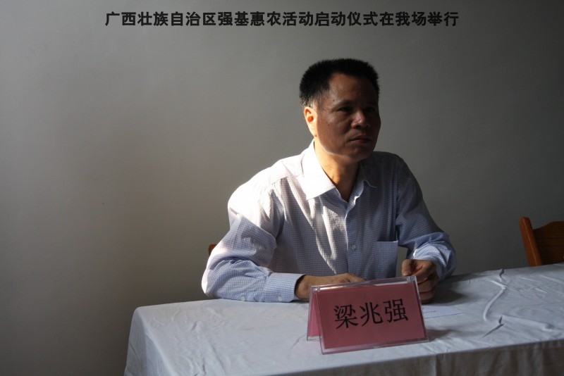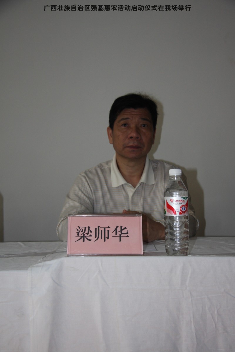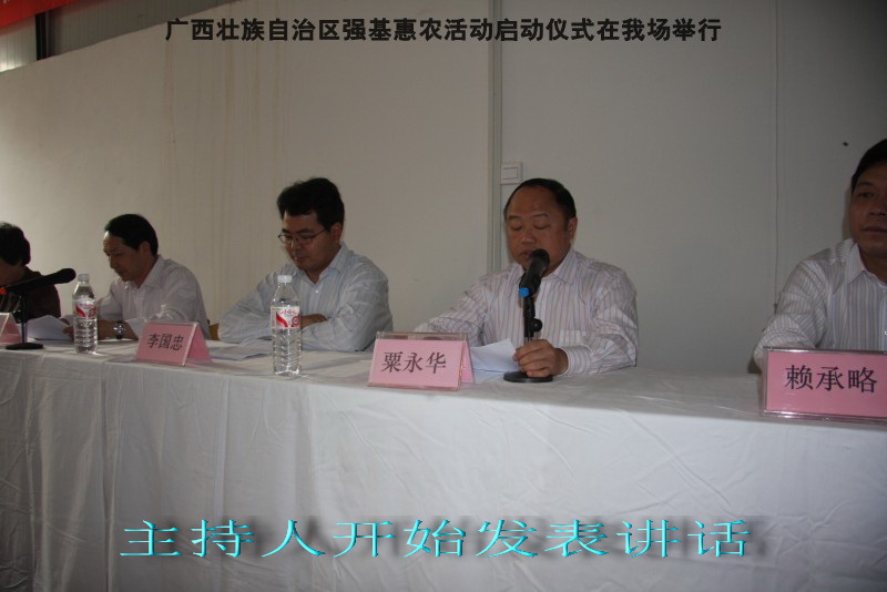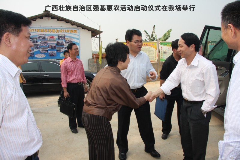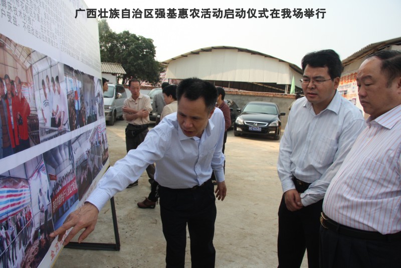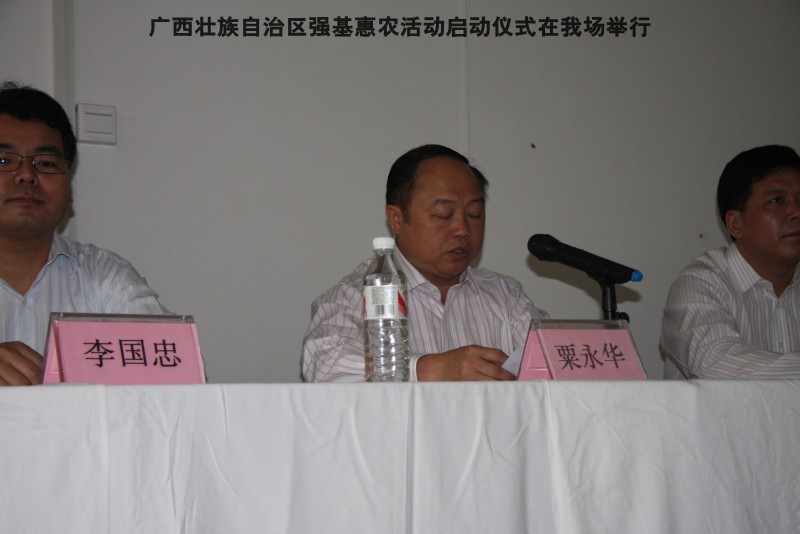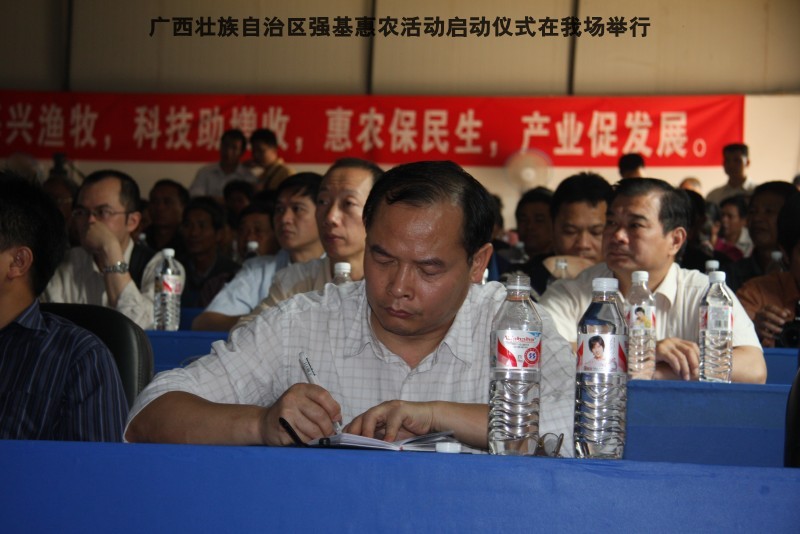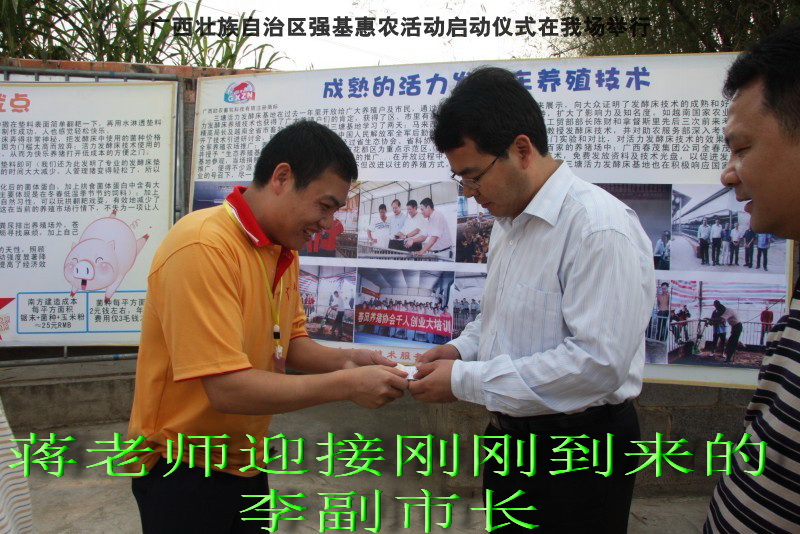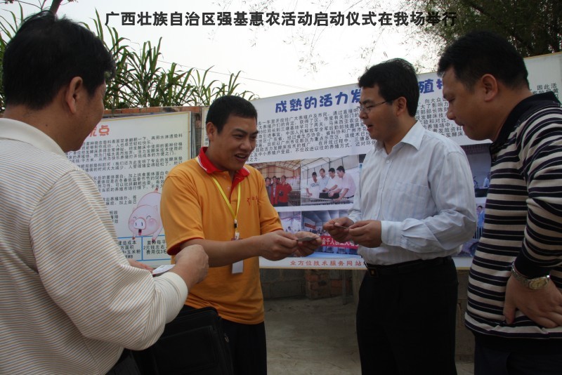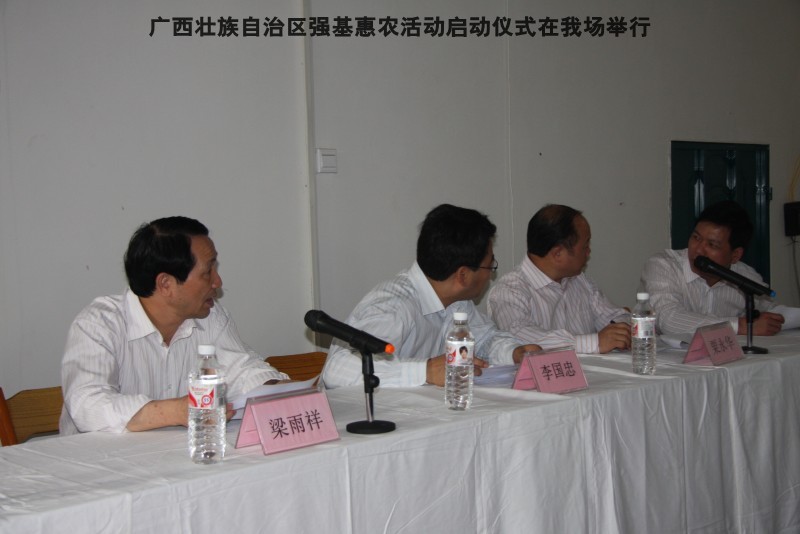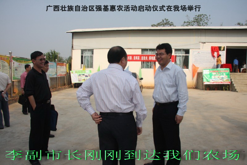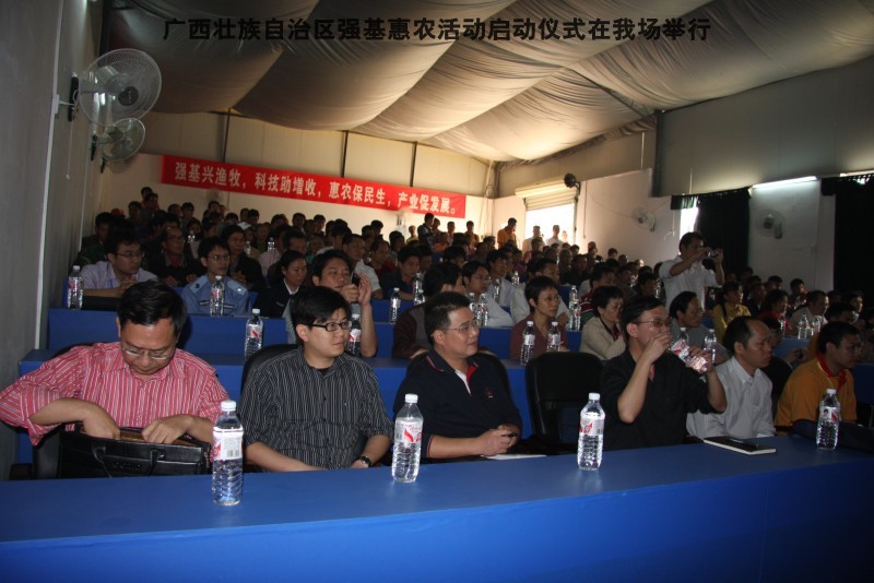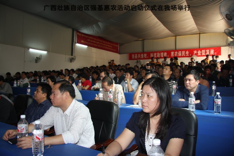 自治区水产畜牧兽医两万名工作队员深入农村开展活动启动仪式由粟永华主持,首先是介绍各位领导,对他们的到来表示感谢。然后几位领导分别发表讲话1.自治区水产畜牧兽医局梁雨祥局长。2.南宁市李国忠副市长。3 南宁市兴宁区高虹区长。领导讲话后,马上进行几个环节惠农活动,1.赠送养殖图书 由农民代表上来领取养殖技术资料和光盘。2.给养殖户赠送鸡苗 3.给我们养殖基地补助十万元强基惠农培训经费(用梁局长的话说,我们给他补助他也是补助农民这样很值得) 4.给我场颁发“强基惠农培训基地”称号5.参观活力发酵床养殖基地现场。