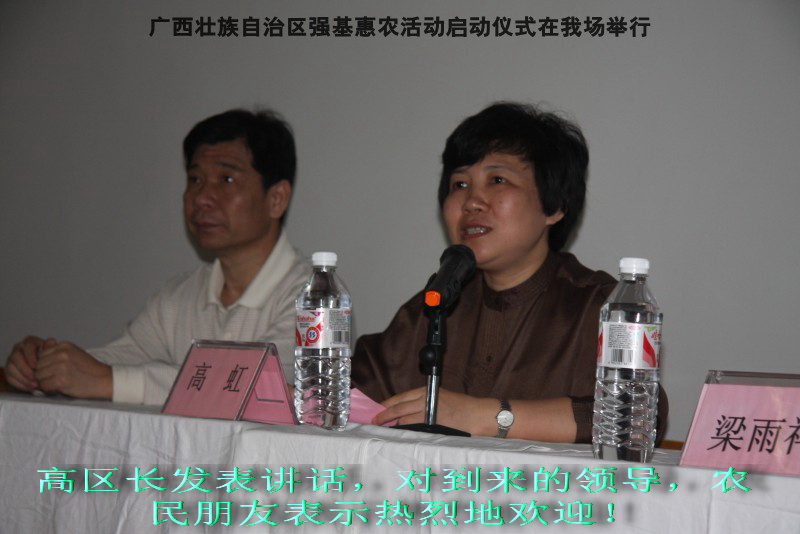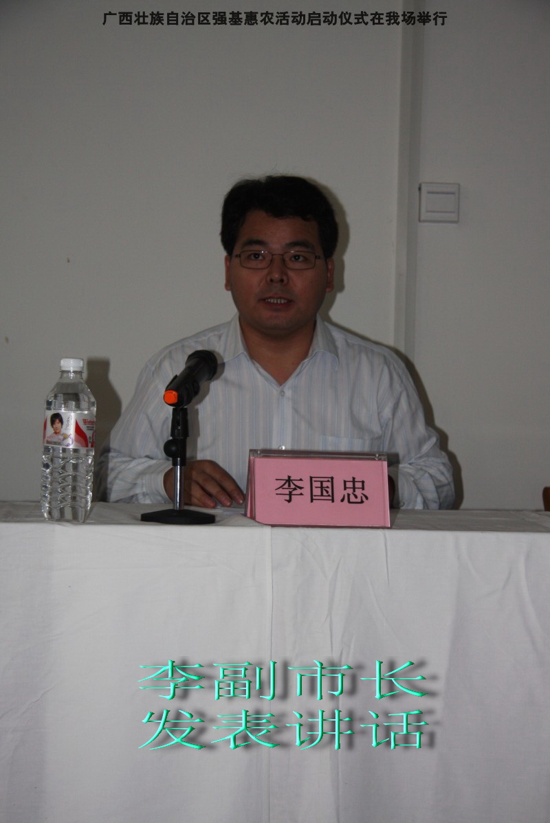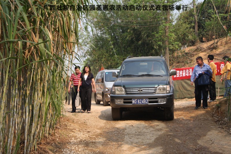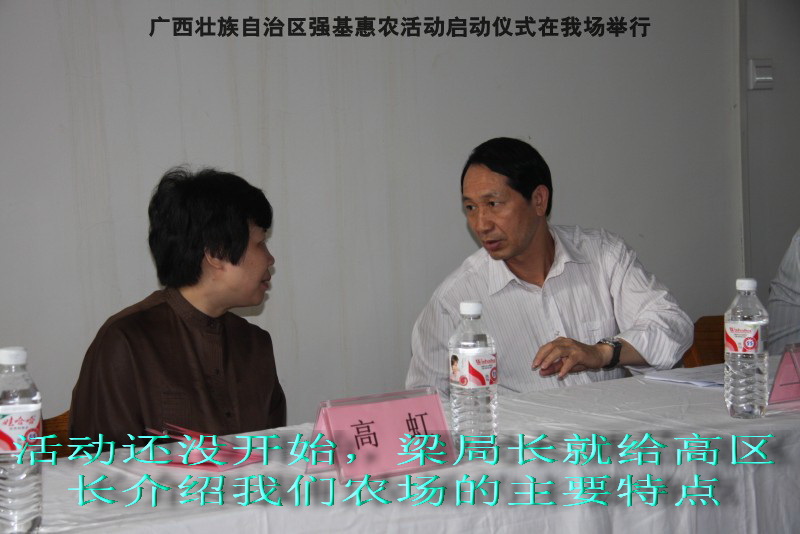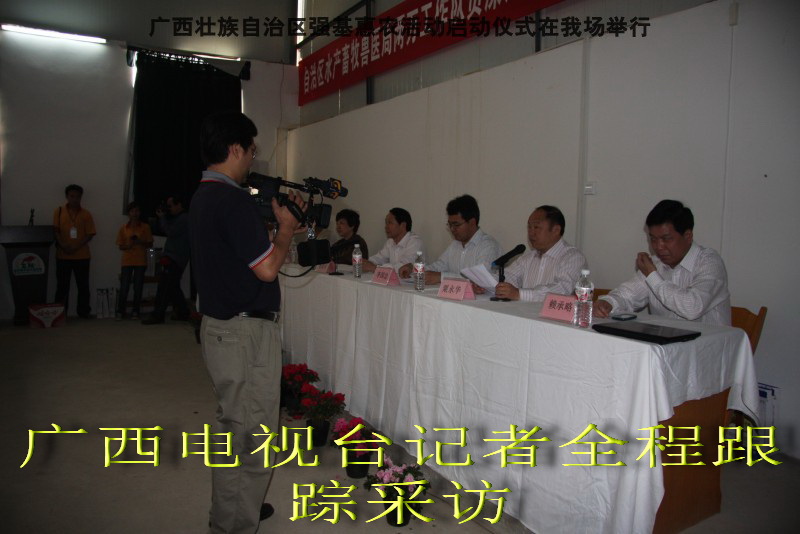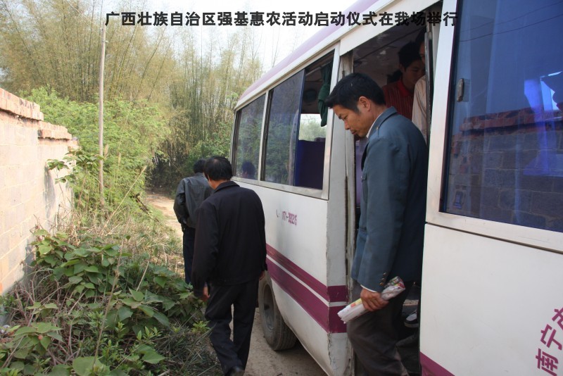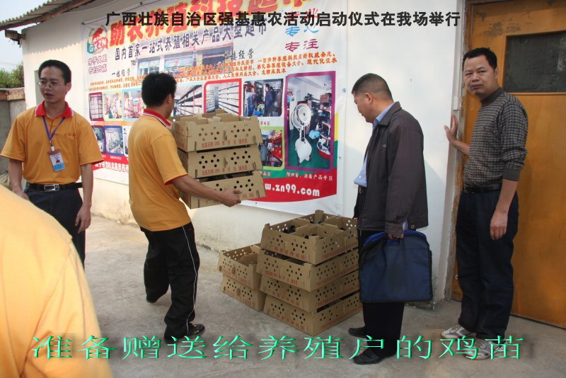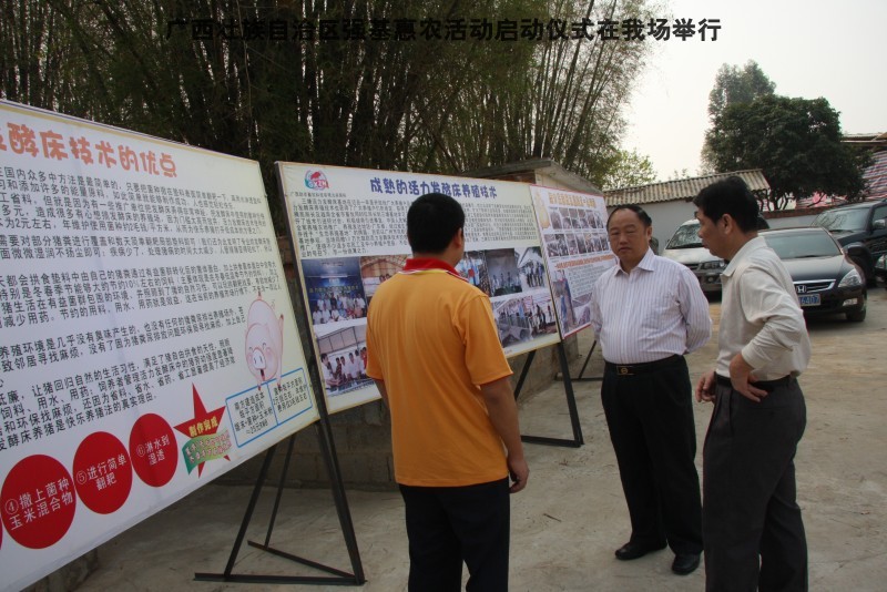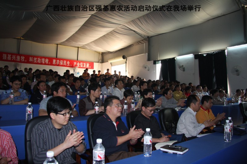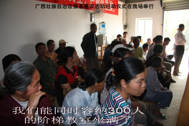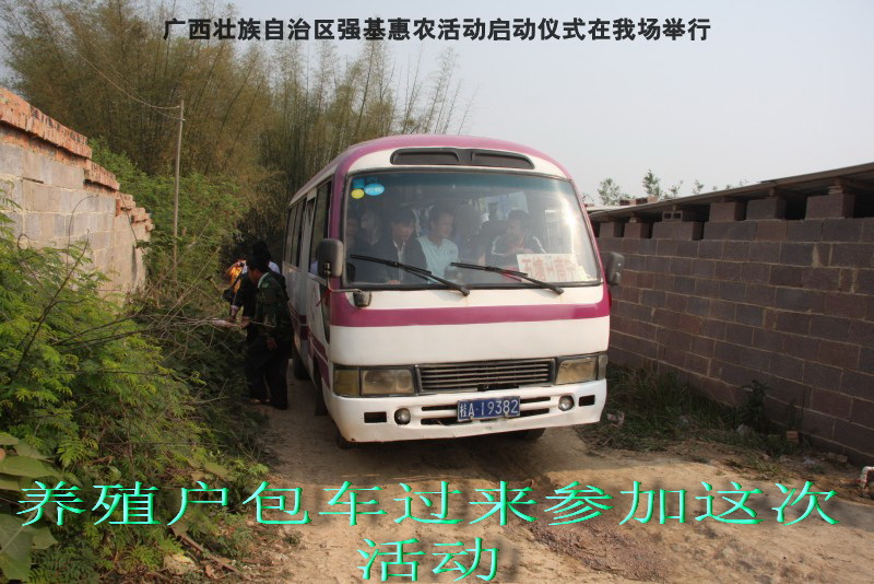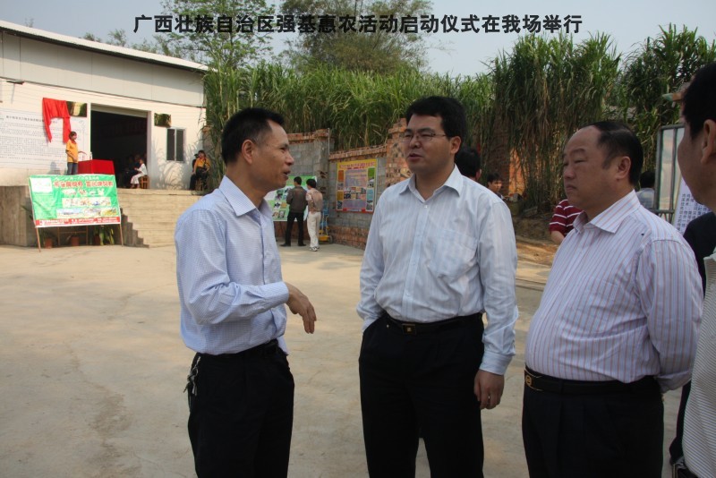 自治区水产畜牧兽医两万名工作队员深入农村开展活动启动仪式由粟永华主持,首先是介绍各位领导,对他们的到来表示感谢。然后几位领导分别发表讲话1.自治区水产畜牧兽医局梁雨祥局长。2.南宁市李国忠副市长。3 南宁市兴宁区高虹区长。领导讲话后,马上进行几个环节惠农活动,1.赠送养殖图书 由农民代表上来领取养殖技术资料和光盘。2.给养殖户赠送鸡苗 3.给我们养殖基地补助十万元强基惠农培训经费(用梁局长的话说,我们给他补助他也是补助农民这样很值得) 4.给我场颁发“强基惠农培训基地”称号5.参观活力发酵床养殖基地现场。