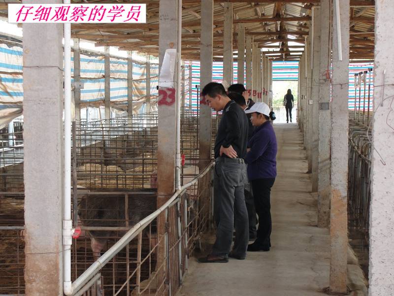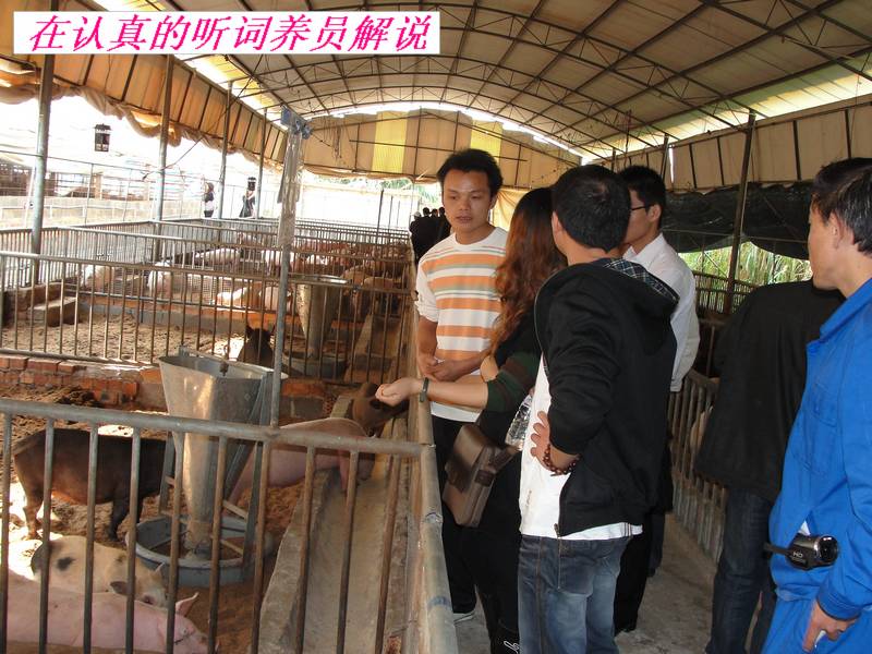 10点半,大家在技术员的带领下,首先去养猪现场参观,在猪栏里,大家见到的完全不是传统猪栏那里比较脏臭,而是非常干净,可以说完全没有臭味,而且猪个个皮毛红亮,很多的参观学习者都是第一次见到这样的养殖方法,感到有点不可思议,围着技术员不断的提问。