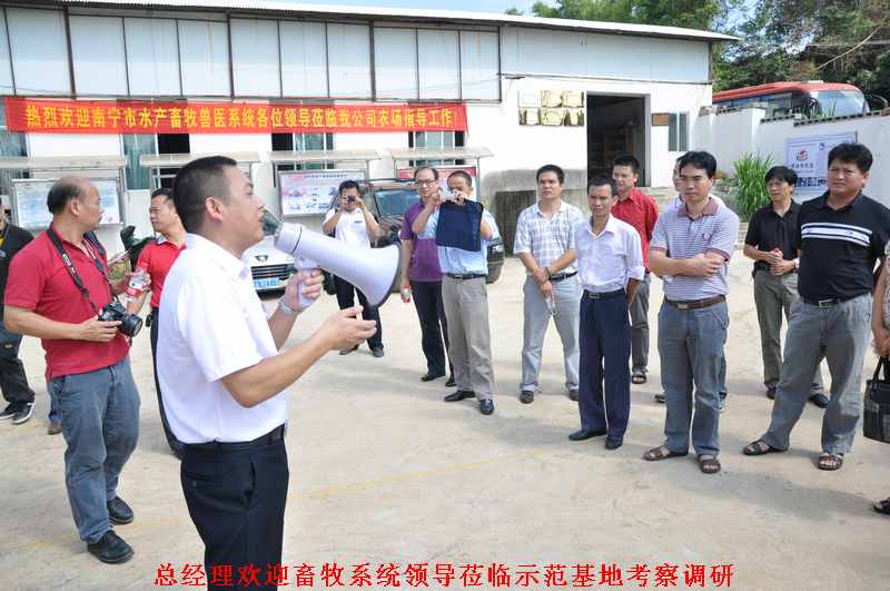 2011年8月17日,来自南宁市各区、县的牧兽医局及各乡兽医站的领导一行,在南宁市水产畜牧兽医局梁兆强局长及雷波副局长的带领下,来到位于兴宁区三塘镇那况村红灯坡的广西助农公司零排放养殖示范基地考察调研。