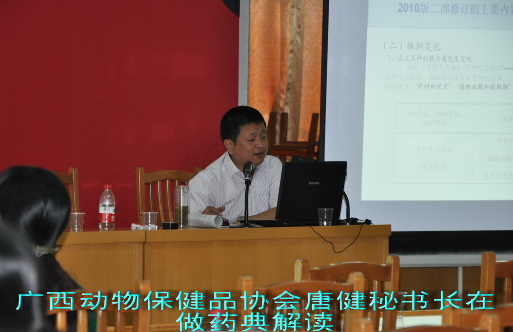 2011年10月17-18日,为期两天的《中国兽药典2010》宣贯、兽药GMP迎检和整改、网络营销知识培训班在南宁市安吉大道金沙湾宾馆七楼会议室举办。本次培训班由广西壮族自治区兽药监察所、广西动物保健协会主办,广西助农畜牧科技有限公司协办。全区各地30多家兽药生产厂家及有关事业单位技术员、企业代表等50多人积极到场与会。自治区水产畜牧兽医局医政药政处陈虹处长出席并发表重要讲话。