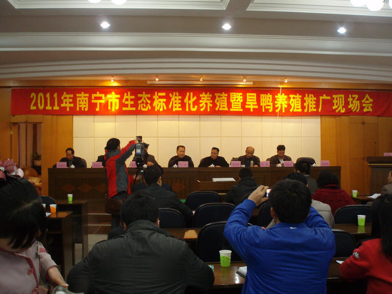 2011年12月30日下午,由南宁市水产畜牧兽医局组织的南宁市发展生态标准化养殖暨旱鸭养殖推广工作现场会在南宁市雷雨宾馆举行。参加此次现场会的领导有自治区水产畜牧兽医局王强副局长,自治区环保厅生态办田雷处长和黄颖专家,市环保局领导以及南宁市各城区、县水产畜牧兽医局、畜牧水产技术推广站主要领导和大型养殖公司老总。会上王强副局长做了重要讲话,王副局长充分肯定了发展生态养殖的重要性和紧迫性,详细分析了南宁市发展生态养殖的优越性和可行性,并寄予希望和工作指示。