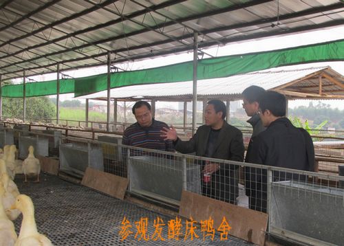 随后,蒋总带领客人来到发酵床养鸭场。在发酵床养鸭场里,杨尚林先生对简易鸭、鹅料槽和饲料搅拌机产生兴趣,蒋总介绍道:我们细心观察了鸭、鹅的采食习惯后,将传统料槽进行改进,别看就是几块铁皮做成的,比传统料槽省料量10%。同行的王谷先生更是拿出相机,拍下了鸭栏下的发酵床电动翻耙机,还用手机记录下这些产品信息。