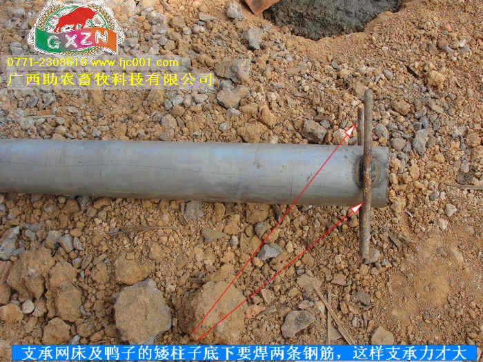 支承网架及鸭子的矮柱子有两个作用,一个是支承鸭子的重量,二是支承自动翻耙机,自动翻耙机的轨道是焊接安装在这些柱子上。中间走道双列式的栏舍,共要四排柱子,有两排与两排铁棚的柱子是重合的,两排在中间走道的两边。