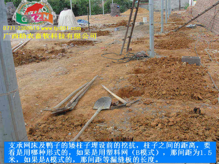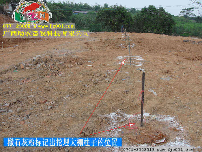 对于安装自动翻耙机的两种模式最好是用大棚铁架结构,这种铁棚结构柱子带顶棚的造价为120元/平方米,比水泥柱+石棉瓦结构的栏舍约贵30~40元/平方米,但是它非常方便安装耙机,而且施工也比较快,使用寿命也比较长。现在铁棚柱子的建造为例,其它的栏舍结构的大同小异。