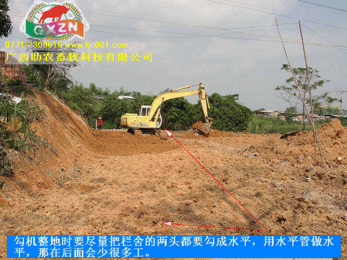 在用勾机整平的时候,一定要做水平,就是栏舍两端的高度一至,要用水平水管来做水平,做好水平后,后面的挖坑和浇筑铁棚柱子地基都非常方面,而且也不用再再行大的地面整平了,省工省时。