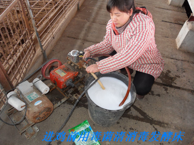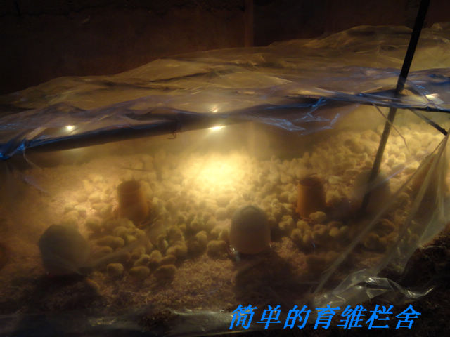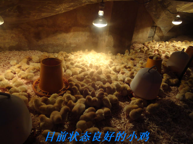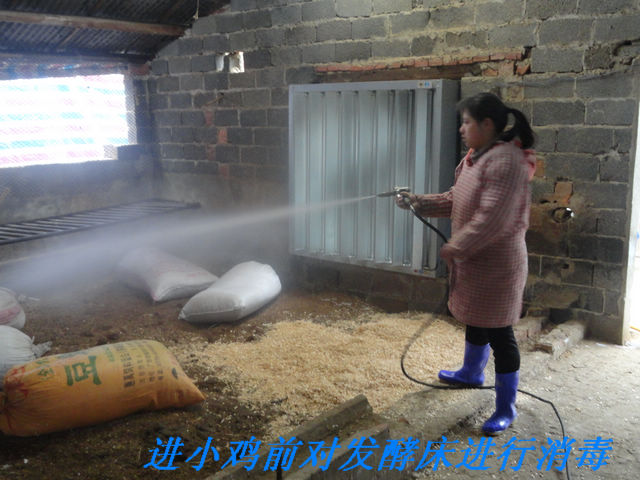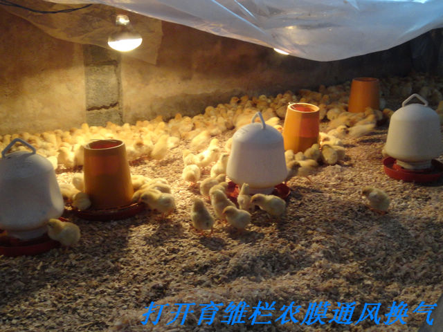 鸡苗进场前,饲养员已经做好了相关的准备工作:消毒工作,对发酵床垫料及整个鸡舍用毒菌清兑水进行消毒。在进雏鸡之前一定要用千分之二的高锰酸钾水或用毒菌清一小包20克对水25公斤把所有的饮水器、食槽切底消毒。保温工作:育雏重要工作之一,如果温度不够会严重鸡苗的健康以及后期的生长。刚出壳的雏鸡由于身体弱小,绒毛稀短,体温调节机能还不健全,如果环境温度骤然猛降,雏鸡就会因缺乏御寒能力而感冒、拉稀,影响蛋黄吸收,甚至挤堆压死。为了使雏鸡正常生长发育,鸡苗进场前,提前将育雏室的温度提高到32--34度。