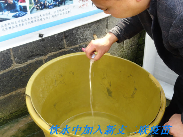 但特别注意的是:做疫苗之前应停水2-3小时(也可根据天气确定),饮水量按全天饮水的1/6供给。饮后间隔1小时恢复正常供水。在疫苗接种水中可加适量脱脂奶粉,以吸附水中有害物质,防止病毒粒子遭受有害因素的破坏,使之不变质,不灭活,而且可使其均匀的分散在稀释液中,从而提高疫苗的免疫作用。