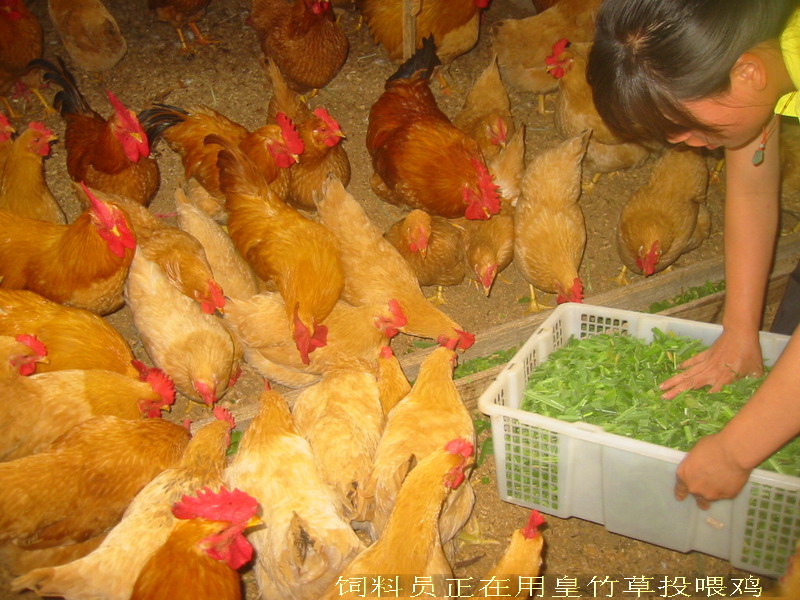 我场养的鸡除了喂蝇蛆,还喂皇竹草、甜象草、黑麦草等。你看这就是工作人员正在用切碎的皇竹草喂鸡,鸡吃了蝇蛆、再补黄竹草或甜象草、黑麦草等。它们吃得真正有味,有些鸡连头都不抬一下争先恐后,其中有一只鸡还抢吃另一只鸡嘴里叼着皇竹草。大公鸡昂着头,象个忠实的大卫士保护着身边的好友。让它多吃些,吃快些,多些营养,产蛋多,蛋的营养丰富。