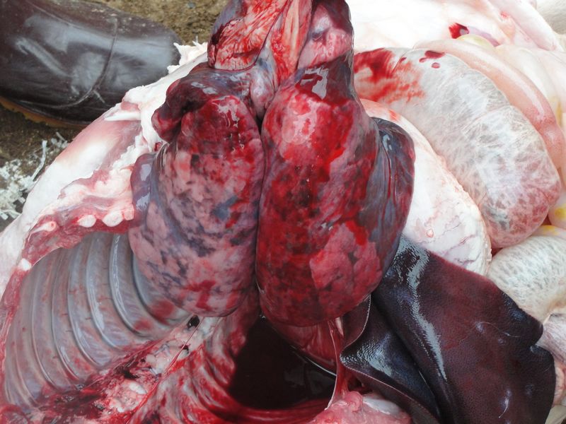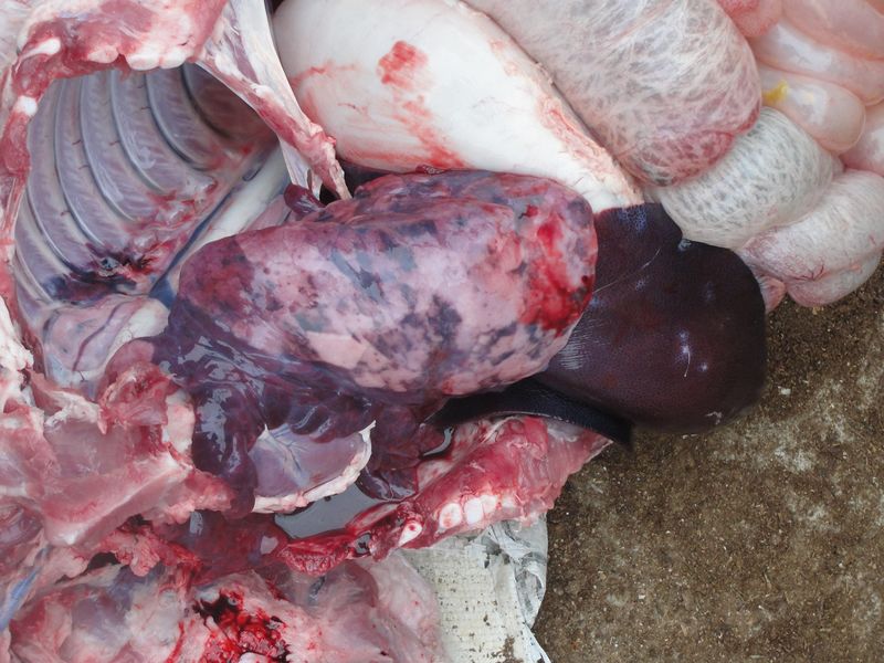 剖出来肺部有部份已经实质病变了。初步诊断可能是传染性胸膜肺炎。我以前用的是啊莫西林