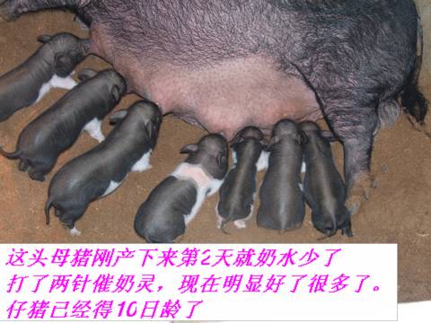 还有给另一头没有奶水的母猪打了催奶灵,这头母猪一共产了10头仔,弱胎死了一头,有两头缺少奶水而死亡。现在还7头在哪里,蛮活泼的。前两天打了一次催奶灵,和在饲料理加了母仔保,今天加强了一针催奶灵。也拍了些相片,和大家分享。