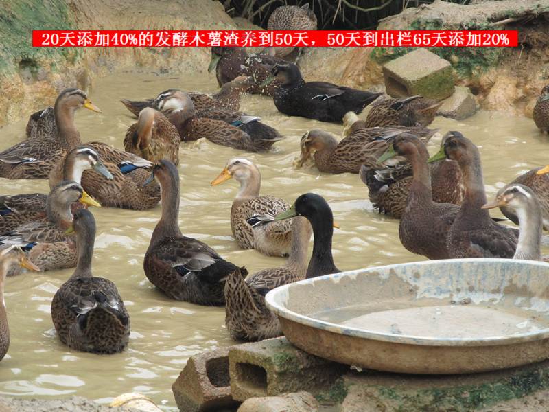 用木薯渣会延长出栏时间,想加快出栏是不可能的。用来养殖优质的鸭子是非常不错的(65天以上)肉质很好,无肥肉。消费者很喜欢。前几批麻鸭实验效果很好。