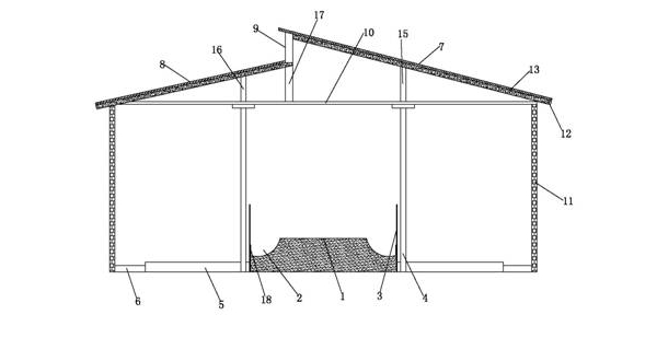 牛舍结构示意图 主体已完工的牛舍 1、饲喂通道 2、饲槽 3、牛栏 4、横梁支撑柱 5、牛床 6、清粪通道 7、右侧屋顶8、左侧屋顶9、屋顶窗户10、横梁 11、主体承重墙 12、10cm苇板13、彩钢铁皮14、墙体窗户15、右侧屋顶支撑柱16、左侧屋顶支撑柱17、屋顶窗户支撑柱 18、饲料槽围栏