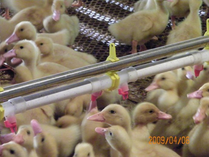(4)饮水。当1日龄鸭到达养鸭场时,因经长距离运输,可能已经缺水,须要小心处置,迅速分入育雏室内。把幼鸭从箱子里取出后,在放入育雏区之前,将每只鸭子的鸭嘴在饮水器里浸一下,这样能使幼鸭容易找到水源。初始28天内,每100只鸭子,提供1只饮水器,每天要清洗饮水器。