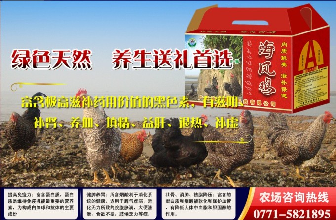 广西助农畜牧科技有限公司经过4年对该鸡品种的繁育、改良,形成了一个全新的品种——海凤鸡,并进行了注册,形成了繁育生产一条龙。海凤鸡从出生到上市需要8个月以上,母鸡紫黑中带花,体态丰满,仪态端庄,实为鸡中贵妇,一般为1.2公斤;公鸡一般转化为阉鸡,最大为3公斤,公鸡腿高颈长,上披黄金丝毛,胸腹尾多为黑中带花,乃堂堂一九尊王者。