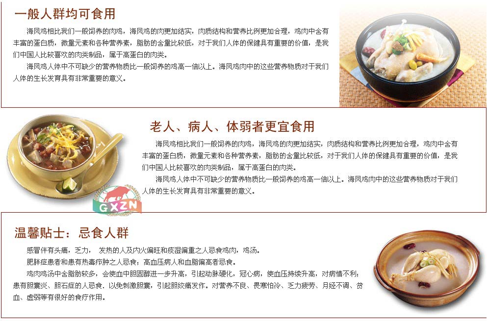 海凤鸡做法与一般鸡肉无异,但不需要放过多的佐料,其肉味香浓郁,细嫩,口感好,几乎与野禽无异,是鸡品种中的上上佳品。