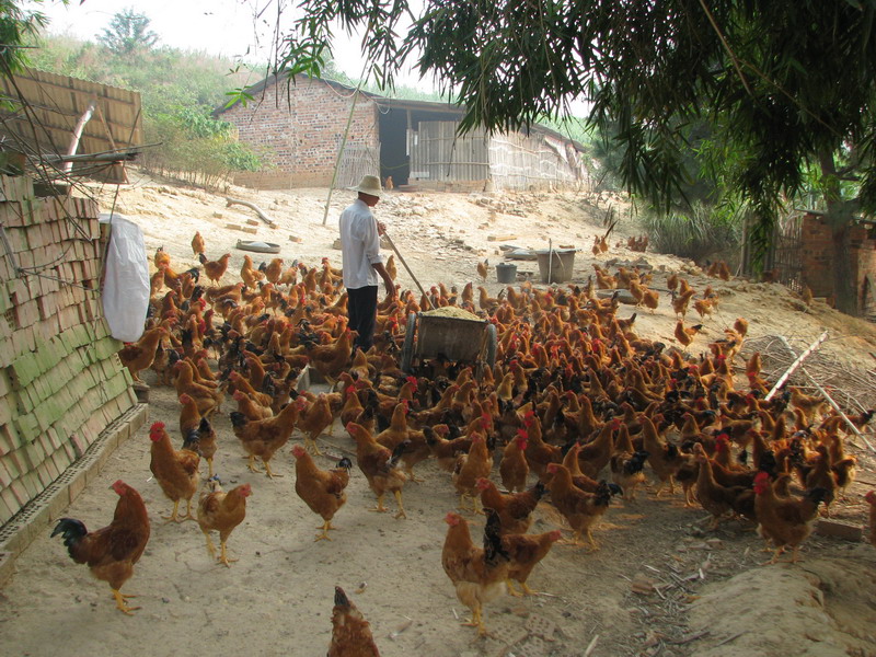 用发酵豆渣、发酵木薯渣饲喂的鸡与全部采用自配精料的鸡来比,在长势、体重和毛色上基本没有太大区别,平均起来饲喂自配精料的鸡同时抓进来,同个人管理,其体重也只是多2~3两,但是节省下来的成本就都出10块钱(阉鸡)。