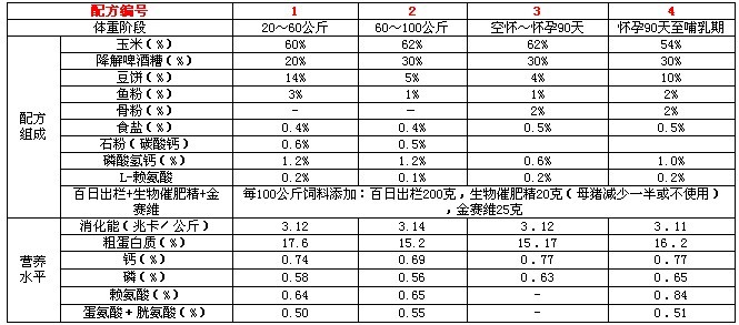 上表中还可以结合当地资源,用麦麸、米糠、谷粉、麦粉、次粉、高粱粉、干草粉、青饲料、花生麸、菜粕、棉粕、向日葵饼、芝麻饼、石粉、肉粉、骨粉、……等代替或部分代替表中的原料,如用当地丰富的其他蛋白饲料代替表中的蛋白原料,以求降低成本,但要注意蛋白能量平衡等,这就要熟悉各种蛋白原料的蛋白含量等营养数据。
