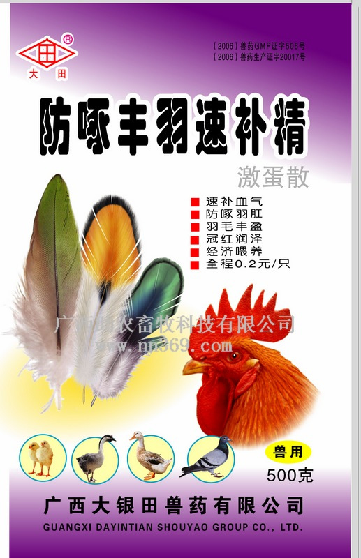 【功能与主治】促进骨骼与羽毛生长,加快生长发育,减少因羽毛生长带来提高料耗的弊病,肉禽羽毛生长速度30%以上,颜色光亮,冠羽红润,改善酮体品质;大幅度减少或甚至杜绝蛋禽、肉禽啄羽、啄肛、啄趾等癖症。并能活血祛瘀、补肾强体、清热解毒、防治输卵管炎,恢复提高产蛋功能。